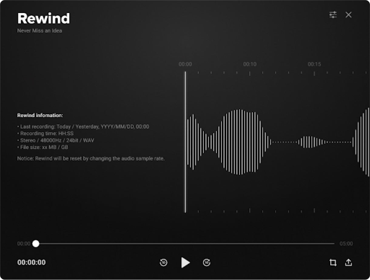 Rewind automatically records up to 10 minutes of your playing, ensuring you never miss a moment of inspiration. Easily grab, trim, and export your perfect riff to build upon your ideas later.